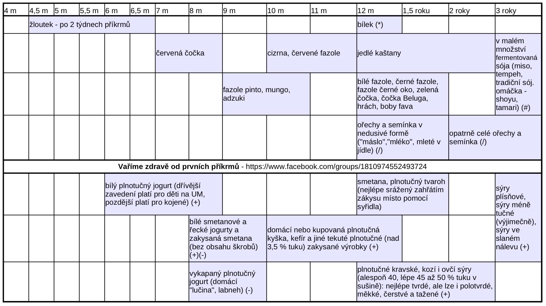 Pár tabulek na závěr, které jsou ze skupiny na Facebooku „Vaříme zdravě od prvních příkrmů„, zde naleznete úplně nejpodrobnější návod, jak zavádět příkrmy, nejčastější otázky na které se maminky ptají a jejich odpovědi. A jestli Vás zajímají kaše, které zde nejsou zmíněny, přečtěte si můj článek na téma KAŠE